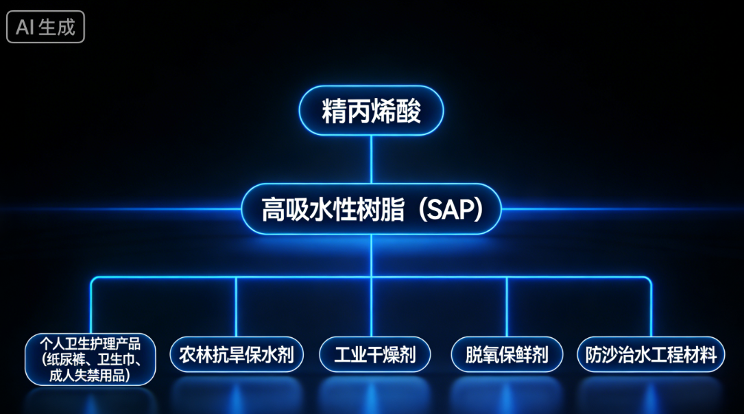 Upstream, the main raw material for SAP is glacial acrylic acid; downstream, its applications are extensive. Initially, it was primarily used in personal hygiene products such as disposable diapers, sanitary napkins, and adult incontinence products, with baby diapers accounting for about 70% of its use. Subsequently, its application scenarios have continuously expanded to include drought-resistant water retention agents in agriculture and forestry, desiccants and deoxidizing preservatives in industrial fields, and engineering materials for sand control and water management. It can be said that SAP serves as a bridge connecting basic chemicals and daily consumer goods, and its market demand is closely related to population structure, hygiene habits, and living standards.