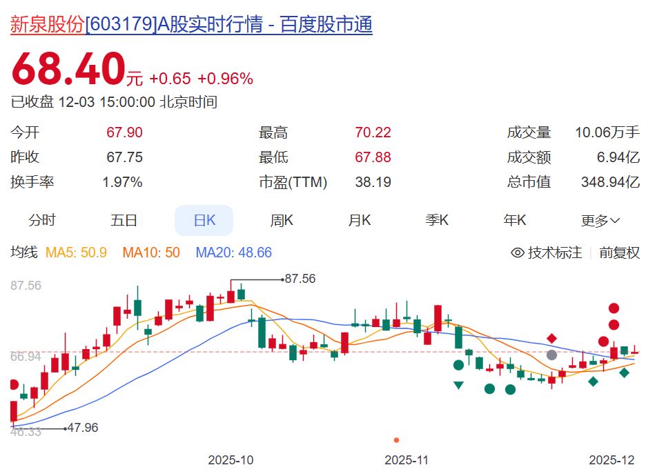 As of the close on December 3rd, the stock price of Xinquan Co., Ltd. was 68.4 yuan, an increase of over 60% for the year, with a total market value of 34.894 billion yuan.