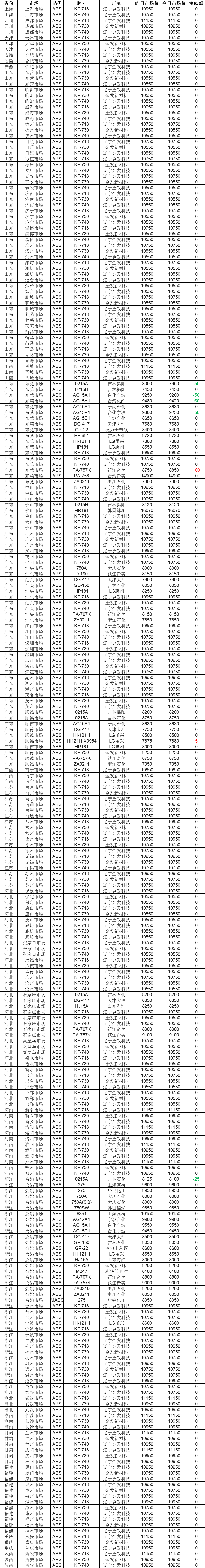 As of 11:00 AM on December 9th, according to Specialized Plastic Vision statistics, the ABS market across various regions in the country is stable with a slight decrease. 97% of the market quotations remain stable, with a maximum drop of 60 yuan. Currently, the Dongguan market quotes Taiwan Fiber AG15A1 at 9,420 yuan. Today's ABS market quotation range is 7,300-16,070 yuan, with a market median of 10,750 yuan.