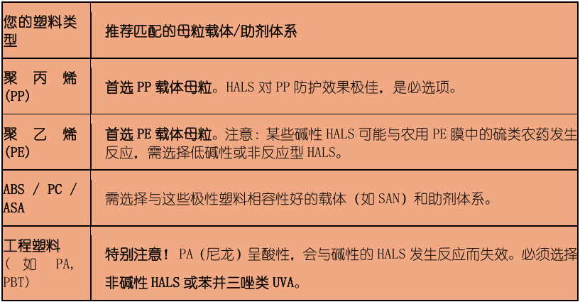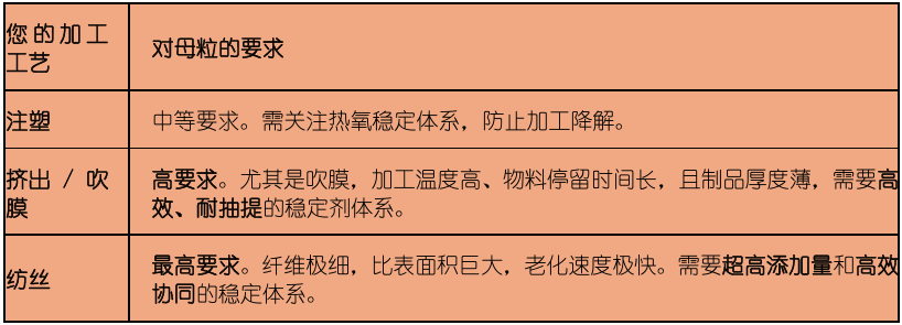 Ask the supplier:My base material is PP. Can your masterbatch carrier and additive system ensure compatibility? My processing technology is XX. How is the processing resistance? (Step 2: Matching)