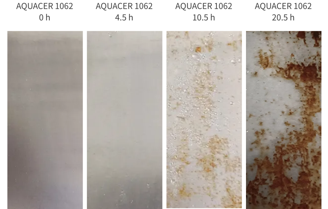 The additive can be mixed with water in any proportion under conditions where the pH value is above 8.5. By adding silicates or common resin emulsions such as acrylic emulsions, styrene-acrylic emulsions, or polyurethane emulsions, the anti-rust performance of metal sheets treated with AQUACER 1062 can be significantly enhanced.