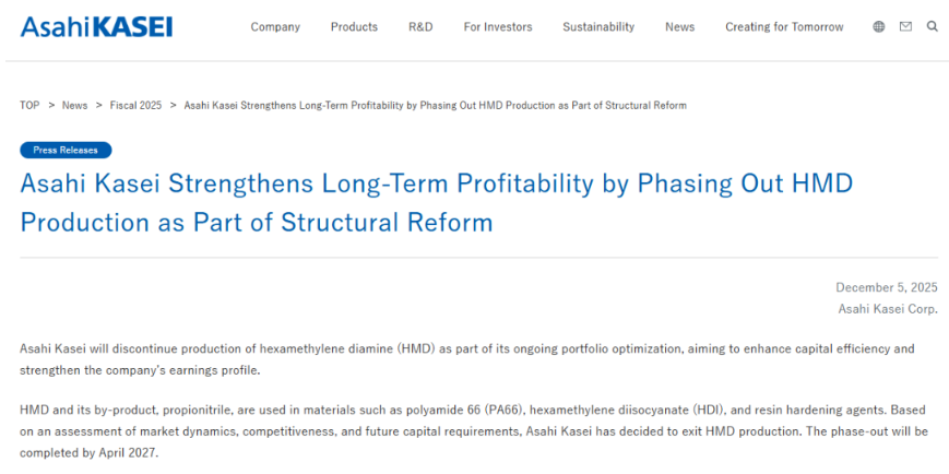 On December 5, 2025, Asahi Kasei Group of Japan announced that it would cease its hexamethylenediamine (HMD) production operations. This decision is an important measure in the group's ongoing efforts to optimize its product portfolio, with the core objective of further improving capital efficiency and enhancing overall profitability.
