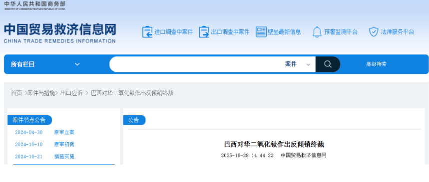 On April 30, 2024, the Foreign Trade Secretariat of the Brazilian Ministry of Development, Industry, Trade, and Services released Announcement No. 15 of 2024, stating that, in response to the application submitted by the Brazilian company Tronox Pigmentos do Brasil S.A. on January 30, 2024, an anti-dumping investigation has been initiated against rutile titanium dioxide originating from China. The products under this investigation do not include anatase titanium dioxide under Mercosur tax code 2823.00.10. On October 10, 2024, the Foreign Trade Secretariat of the Brazilian Ministry of Development, Industry, Trade, and Services issued Announcement No. 54 of 2024, making a positive preliminary ruling on the case. On October 21, 2024, the Management Executive Committee of the Brazilian Foreign Trade Council issued Resolution No. 652 of 2024, deciding to impose temporary anti-dumping duties on rutile titanium dioxide originating from China for a period not exceeding six months, with duty amounts ranging from $577.73 to $1,772.69 per ton.