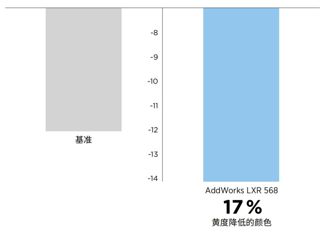 The customer only needs toReplace some of the antioxidants with AddWorks™ LXR 568.Easily add to the selected resin and use in the intended process to significantly reduce the discoloration of materials during molding, and the final material's yellowing degree is less than before.Reduced by 17%Just the right shade of white is presented.Improved the appeal and marketability of the final material.。
