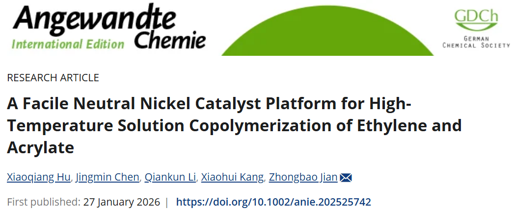 On January 27, 2026, this research achievement was published under the title "A Facile Neutral Nickel Catalyst Platform for High-Temperature Solution Copolymerization of Ethylene and Acrylate." Angew. Chem. Int. Ed.The corresponding author of the paper in the journal is Jianzhong Bao, Researcher, and the first author is Dr. Xiaoqiang Hu; the DFT calculations in the paper were performed by collaborator Professor Xiaohui Kang.