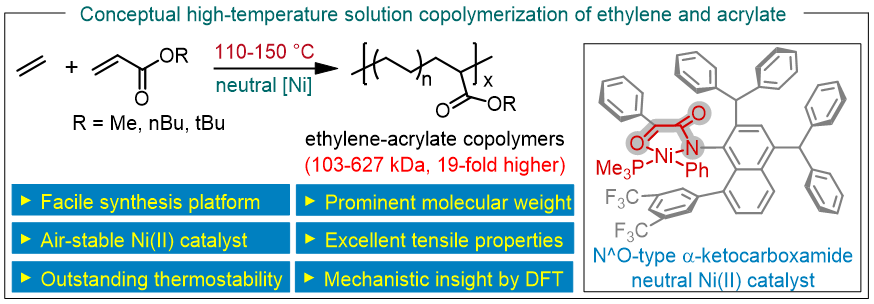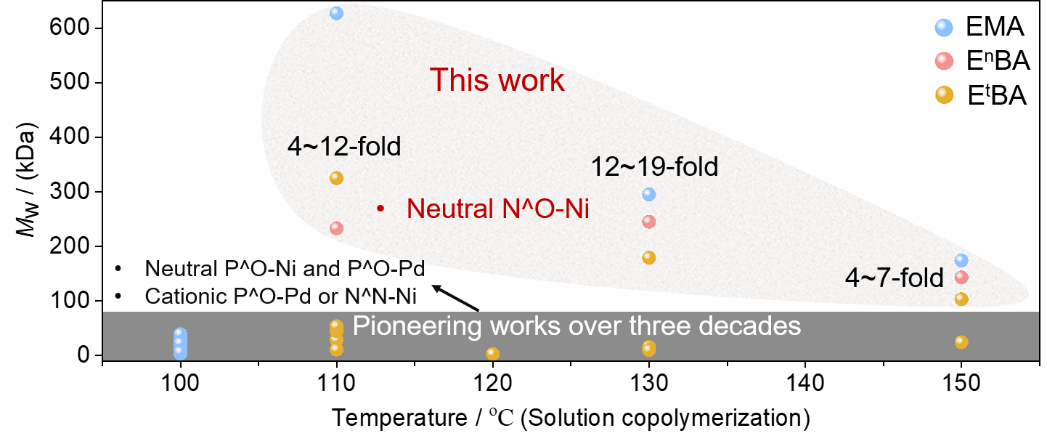In contrast, nickel catalysts offer a superior solution for the copolymerization of ethylene with acrylates; however, the higher oxophilicity of nickel catalysts makes copolymer synthesis extremely challenging. For instance, classical neutral salicylaldiminato nickel catalysts remain ineffective. The emergence of neutral phosphine-phenolate nickel catalysts in 2017 greatly promoted the efficient copolymerization of ethylene and acrylates; however, the polymerization performance of these catalysts at high temperatures is still underdeveloped. For example, even with current catalysts, only low-molecular-weight linear ethylene-acrylate copolymers (< 55 kDa) can be synthesized at high temperatures (≥ 100 °C), which severely limits the mechanical properties of the copolymer materials (Figure 1). The synthesis of high value-added ethylene-acrylate copolymers using the industrially preferred HTSP technology still faces significant chemical and catalytic hurdles, including low catalyst thermal stability and low polymer molecular weight at high temperatures. This requires addressing three key issues simultaneously: improving catalyst thermal stability, enhancing tolerance to polar functional group poisoning, and suppressing chain transfer reactions at high temperatures.
