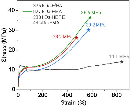 This nickel catalyst platform can catalyze the high-temperature solution copolymerization of ethylene and acrylate to produce high-molecular-weight ethylene-acrylate copolymers (Figure 2) without the need for alkylaluminum as a scavenger and cocatalyst. In the industrially preferred high-temperature range (110-150 °C), high-molecular-weight (103-627 kDa) ethylene-acrylate copolymers were synthesized with a breakthrough, achieving a maximum molecular weight increase of up to 19 times (Figure 3). This shift from low to high molecular weight is crucial for practical industrial applications, endowing the ethylene-acrylate copolymer materials with excellent mechanical properties (Figure 4).