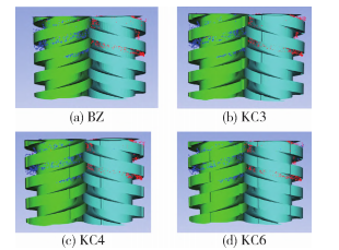 Due to the grooving of the screw, the pressure-building capacity of the extruder is improved, the degree of irregular particle movement is enhanced, and the axial mixing performance is better. From the experimental results shown in Figures 14-15, it can be observed that the extrusion effect of polylactic acid in the grooved screw is superior to that in the standard screw. Among them, KC3 exhibits the best performance, while KC6 is slightly lower than that of KC3.