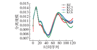 The statistical results of the distribution index for the slotted screw and the conventional screw are illustrated in Figure 11. The distribution index curve of the slotted screw is generally consistent with that of the conventional screw. The peak observed at time zero is due to the reflux phenomenon at the inlet of the extruder. Initially, the particles are unevenly mixed in the extruder, leading to an upward trend in the curve during the time series of 20 to 30. As time progresses, the particle distribution gradually becomes more uniform, and the curve shows a downward trend. The minimum values reached by KC3 and KC6 are similar, but overall, the transient distribution of KC3 is closer to the optimal distribution compared to the other three types of screws, indicating that KC3 has the best mixing uniformity.