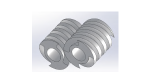 In Solidworks software, draw the geometric model of the counter-rotating twin-screw, with the Z-axis positive direction as the polylactic acid extrusion direction. The screw length is 30 mm, and the gap is 0.5 mm. The left screw rotates counterclockwise, and the right screw rotates clockwise. Draw the left and right screws as shown in Figure 2.