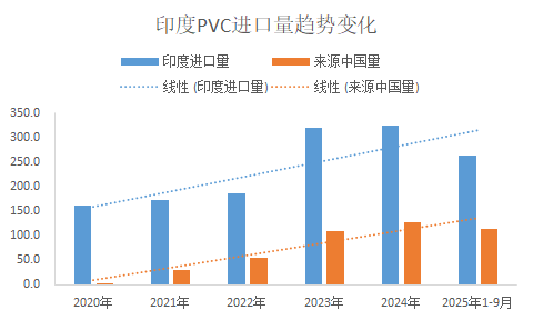 Figure 2Analysis of the changes in India's PVC import volume from 2020 to September 2025, unit: 10,000 tons. |