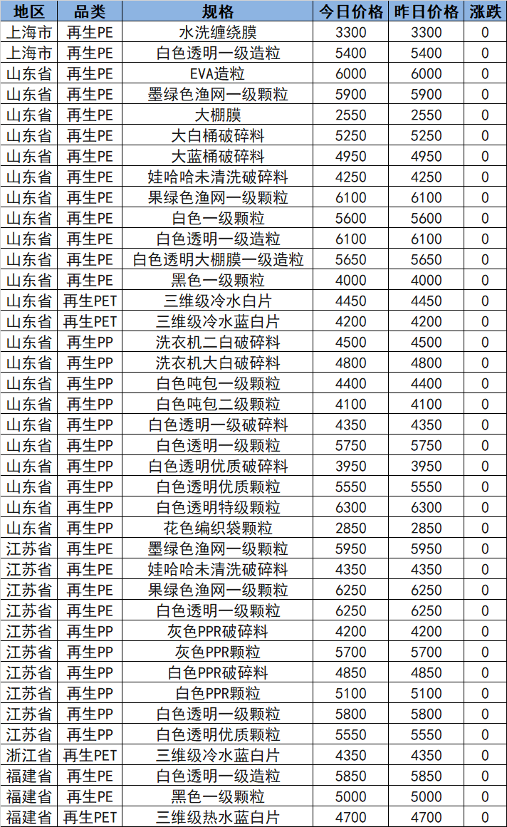 Summary: Morning price update for the East China recycled plastic market on March 13—The East China recycled plastic market remains stable.Recycled PE in Shanghai is quoted at 3300–5400; recycled PET in Shandong is quoted at 4200–4450, and recycled PE at 2550–6100; recycled PE in Jiangsu is quoted at 4350–6250. Market prices are stable, downstream demand remains at routine levels, and traders are shipping normally.