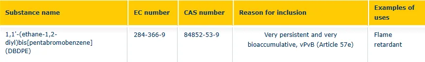 The ECHA Member State Committee has recently confirmed the addition of 1,1'- (ethane-1,2-diyl) diphenyl (DBDPE) to the list. This substance has very persistent and very bioaccumulative properties and is used as a flame retardant in various industries. This identification will support potential restriction work on brominated flame retardants.