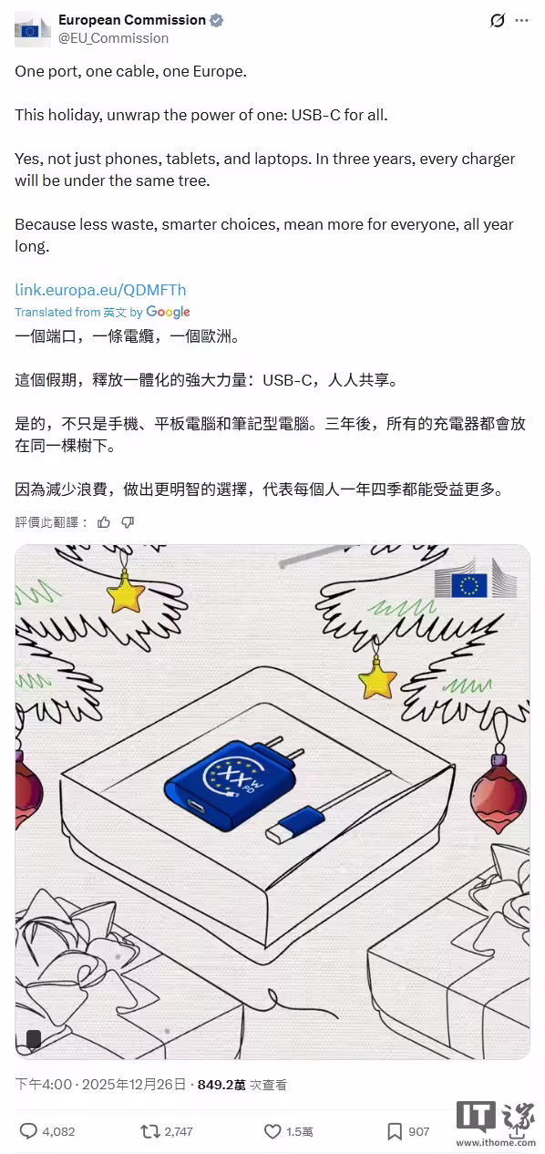 According to the tech media techAU, the European Union will implement new regulations starting from December 2028 (three years from now), requiring all external power adapters sold in the EU to be equipped with a USB-C interface, covering devices such as routers, computer monitors, and smart home hubs.Aiming to provide a more unified charging experience.。