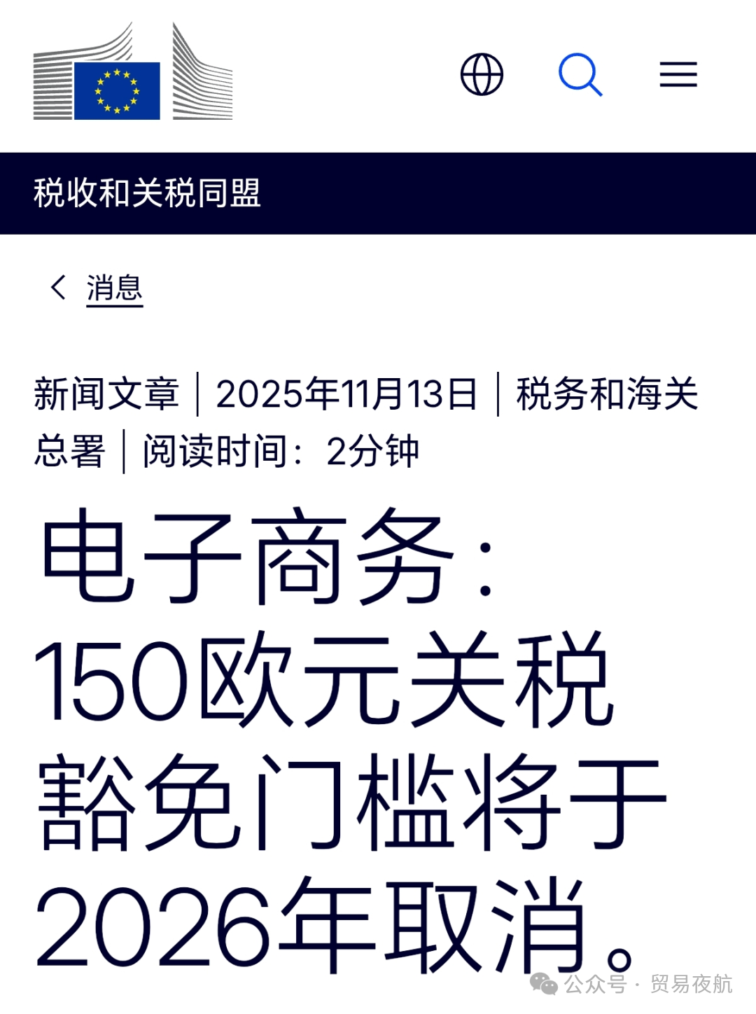 Starting from January 1, 2026, the European Union will abolish the de minimis exemption for parcels valued at less than 150 euros (approximately 1236 RMB).