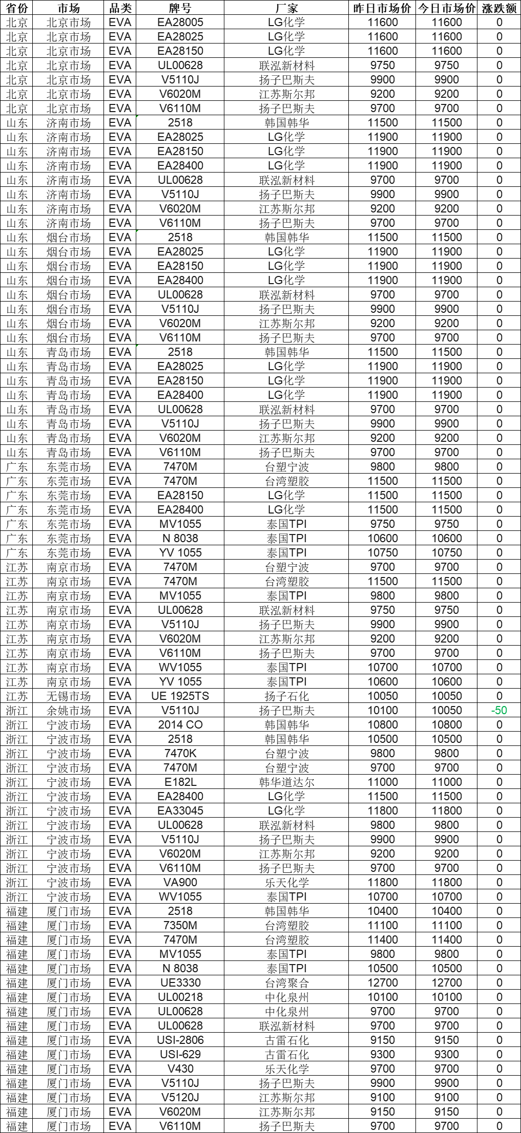 According to the statistics from Zhuangsu Shijie, as of 11:00 AM on December 9, the EVA market across the country is steadily declining! 99% of the market quotes remain stable, with a maximum drop of 50 yuan. Currently, the price of Yangzi BASF V5110J in the Yuyao market is 10,050 yuan. Today's EVA price range in the entire market is 9,100-12,700 yuan, with a market median of 9,900 yuan.