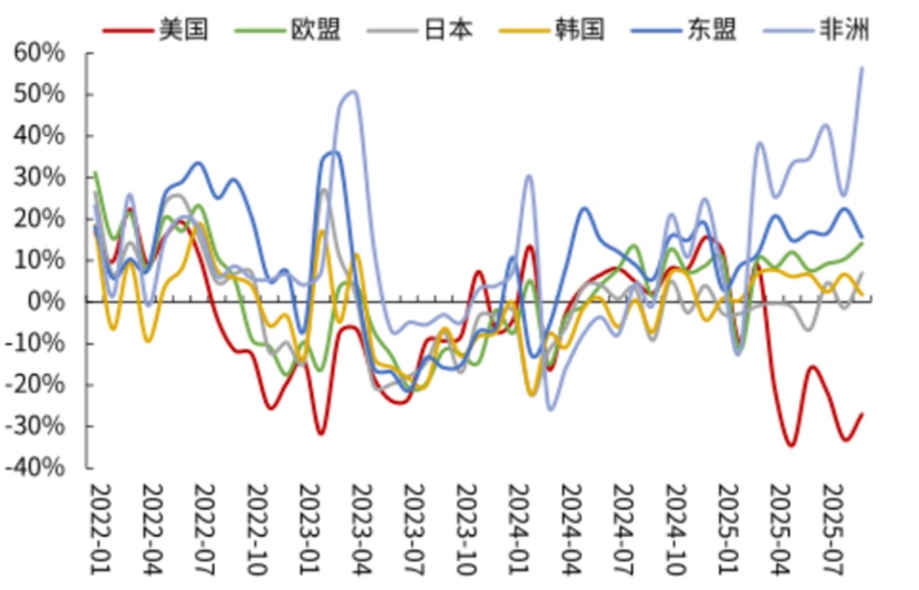 Figure: Year-on-year export growth rate of China to various countries or regions.