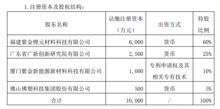Lithium sulfide is one of the main raw materials for sulfide solid-state electrolytes and is regarded as a core material in the key technological pathway for next-generation power batteries. According to the announcement, the project mainly focuses on the research and development, production, and operation of high-purity battery-grade lithium sulfide products, with a planned construction period of 10 months. The registered capital of the project company is 100 million yuan, of which Zijin Mining's wholly-owned subsidiary, Fujian Zijin Lithium Material Technology Co., Ltd., contributes 60 million yuan for a 60% stake, Guangxin Research Institute contributes 25 million yuan for a 25% stake, Xiamen Zijin New Energy Materials Technology Co., Ltd. contributes 10.06 million yuan through patent technology and proprietary technology evaluation for a 10% stake, and Fosu Technology contributes 5 million yuan in cash for a 5% stake.
