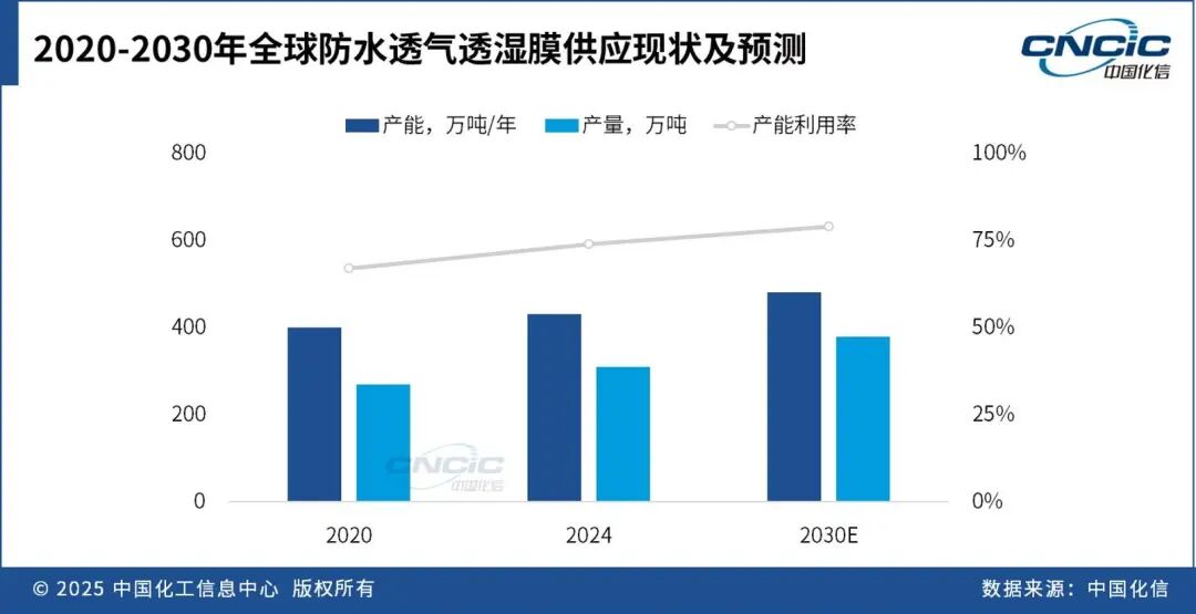 In 2024, the global production capacity for waterproof and breathable membranes is approximately 4.3 million tons per year, with a production output of around 3.1 million tons. The industry primarily operates on a production-to-sales basis, with production volume essentially equating to consumption volume. In 2024, the global market size for waterproof and breathable membranes is estimated to be about $7.5 billion. From 2020 to 2024, the total production of global waterproof and breathable membranes has maintained steady growth, with an average annual growth rate of 3.5%. It is expected that from 2025 to 2030, the average annual growth rate will remain around 3.5%, consistent with the past five years. By 2030, the global demand for waterproof and breathable membranes is projected to reach 3.8 million tons.