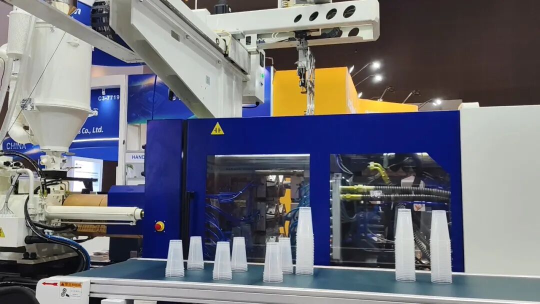 Trade show site,Haitian MA3800H/1280PRO Injection Molding MachineDemonstration of producing a 500ml milk tea cup with a 1 out of 6 ratio.The raw material uses custom-made MFI=60 milk tea cup-specific PP material from Haitian Tongchuang, paired with the Haitian Zhilian high-speed high-strength robotic arm VS1100-ID.