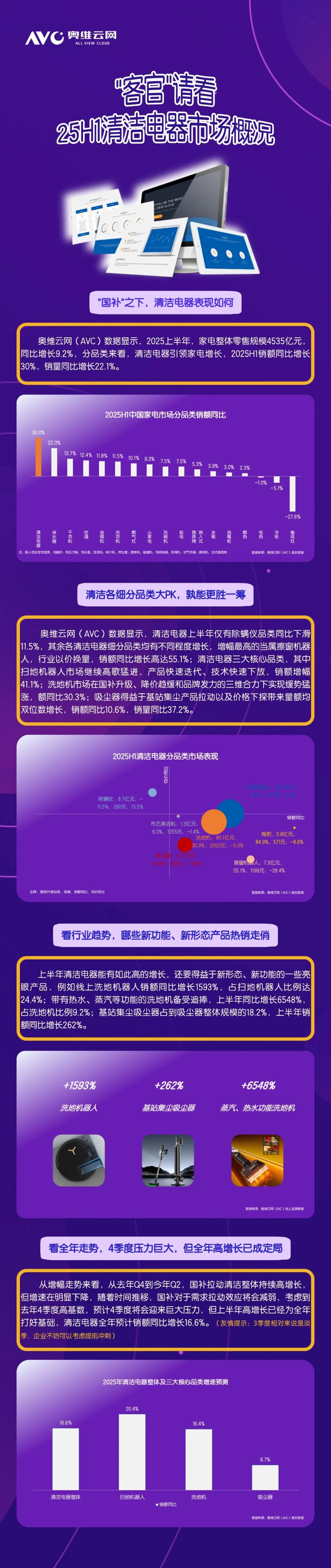 In the first half of 2025, China’s home appliance market saw significant growth driven by the “national subsidy” policy, with cleaning appliances standing out in particular. According to data from AVC (Aowei Cloud Network), sales revenue of cleaning appliances increased by 30% year-on-year, far surpassing the overall home appliance growth rate of 9.2%. The following chart, combined with data analysis, will interpret the market performance, popular categories, and future trends of cleaning appliances, providing reference for consumers and industry observers.
