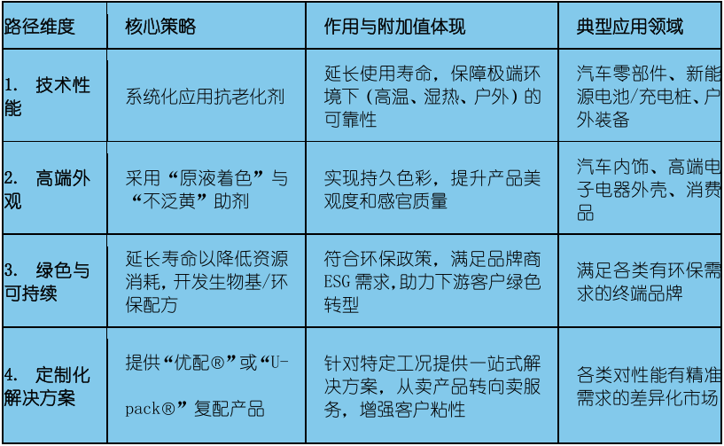 For nylon modification enterprises, enhancing product added value through anti-aging technology is crucial, focusing on transforming this technology from a cost item.Transform into a key value tool to address customer pain points, expand into high-end markets, and meet environmental demands.Companies can achieve this through the following four strategic levels.