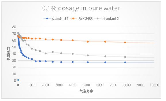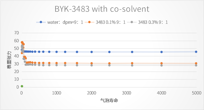 Therefore, the performance potential of BYK-3483 needs to be fully realized through proper formulation techniques.Add an appropriate amount of co-solvent.(The use of ether solvents) is a key step in activating its optimal performance. As shown in the figure below, an appropriate co-solvent can significantly enhance its performance in reducing surface tension.