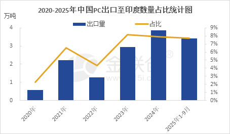 From January to September 2025, China's PC exports to India amounted to 34,100 tons, accounting for 7.74% of the total exports. Although the proportion has decreased compared to previous years, the total annual PC exports to India in 2025 are expected to increase. The recent adjustment in BIS policies will directly impact the export strategies and market competition landscape for Chinese PC companies.