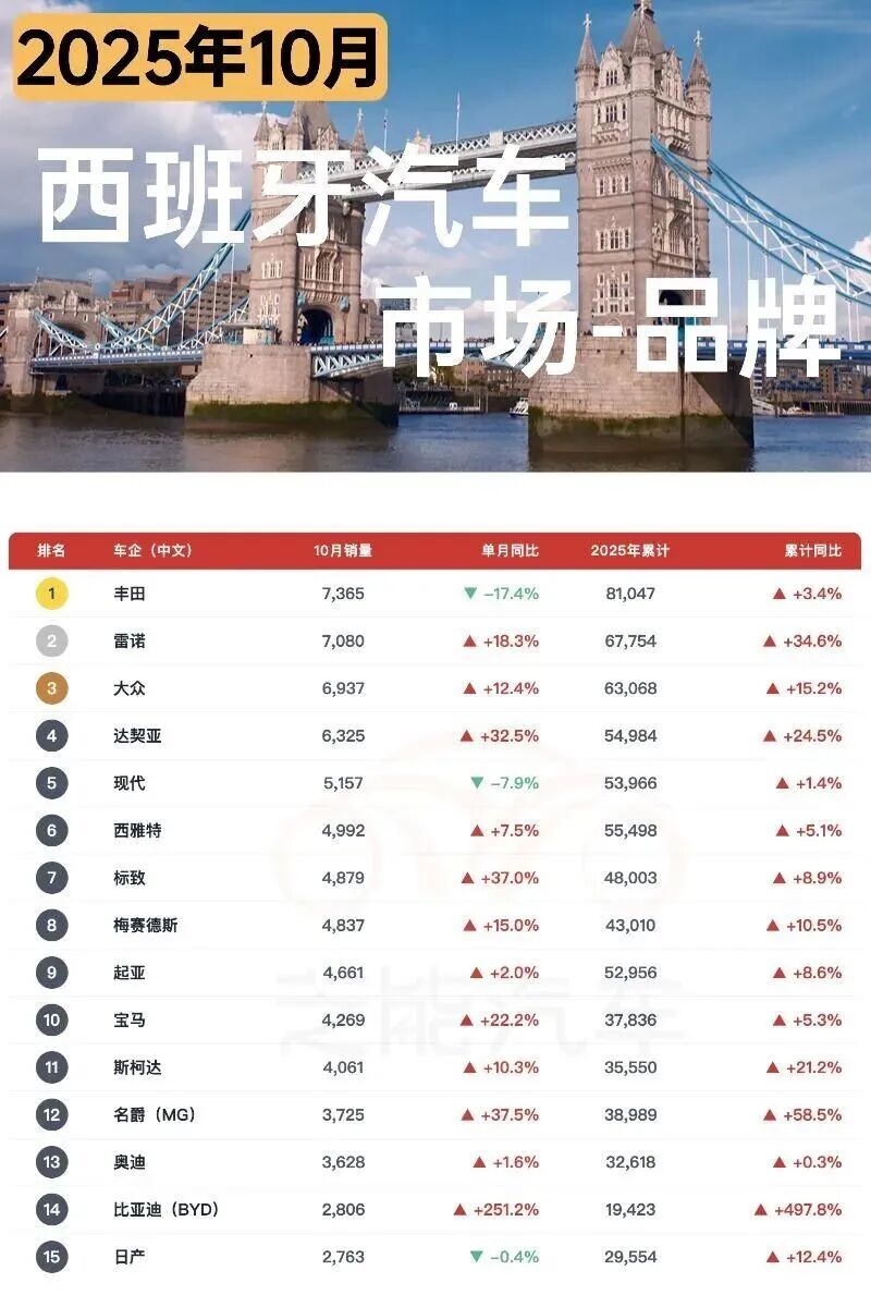 From the perspective of actual results, Chinese car brands have performed remarkably well in the Spanish market. From January to October 2025, MG sold 38,989 vehicles in Spain, a year-on-year increase of 58.5%; BYD sold 19,423 vehicles, a year-on-year surge of 497.8%. These figures confirm Spain's status as a bridgehead for Chinese car brands in Europe.