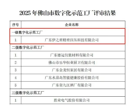 Recently, the Foshan Municipal Bureau of Industry and Information Technology announced the evaluation results of the 2025 Digitalization Demonstration Factories, and Guangdong Yizumi Precision Molding Machine Co., Ltd. successfully won the title of Level 1 Digitalization Demonstration Factory with its outstanding intelligent manufacturing practices, becoming one of only seven companies in the city to be selected. This is another authoritative recognition Yizumi has received in the field of intelligent manufacturing, following its selection as a "2025 Advanced Intelligent Factory" in Guangdong Province last August.