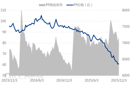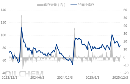 As of 2025 Year 12 Month 3 In China, the total commercial inventory of polypropylene reached 84.29 10,000 tons, an increase compared to the previous period. 3.09 10,000 tons, month-on-month increase 3.80% In the early period, repair devices gradually resumed operation, increasing supply pressure, leading to a rise in production enterprise inventories during the week. At the beginning of the month, intermediaries started new order plans, resulting in an increase in sample enterprise inventories. Tight shipping space in the Asian region further pushed up sea freight costs, leading to dual pressure on imports and exports, reducing resource inflow, and thus continuing port inventory depletion during this cycle. Overall, this week saw an increase in total commercial inventory.