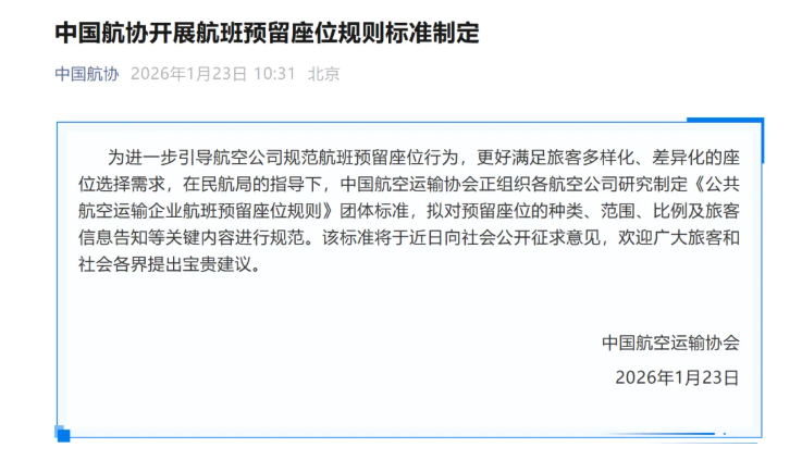 According to ZS Insights, the China Air Transport Association (CATA) announced today that, in order to further guide airlines to standardize the practice of reserving seats on flights and better meet the diverse and differentiated seat selection needs of passengers, under the guidance of the Civil Aviation Administration of China (CAAC), CATA is organizing various airlines to study and formulate the group standard "Rules for Reserved Seats on Flights of Public Air Transport Enterprises," which intends to regulate key content such as the types, scope, and proportion of reserved seats, as well as the notification of passenger information.