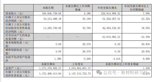In the current quarter, the total operating revenue was 101 million yuan, an increase of 4.38% year-on-year. The net profit attributable to shareholders for the third quarter was 16.2335 million yuan, with the year-on-year growth rate further expanding to 30.19%. The single-quarter profit growth rate hit a new high, demonstrating the company's continued optimization of operational efficiency in the third quarter.