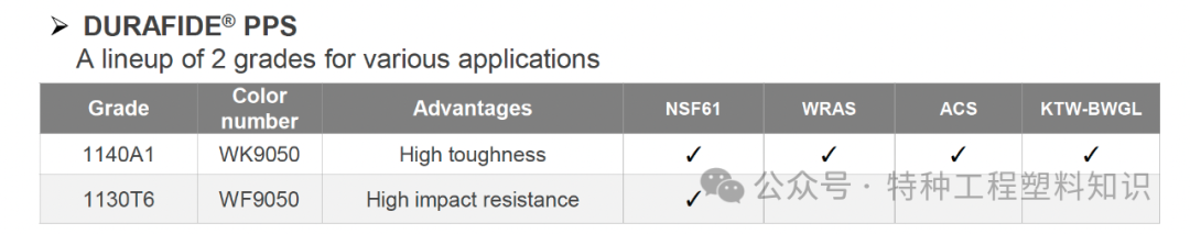 Secondary drinking water certification DURAFIDE PPS 1140A1, 1130T6, with drinking water certifications NSF61, WRAS, ACS, KTW-BWGL.