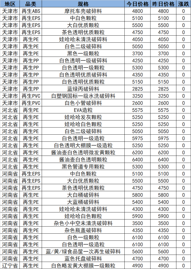 Summary: New prices for the North China recycled plastics market in the morning of December 4th! The North China recycled market remains stable across the board, with recycled PE in Hebei quoted at 5050-6400; recycled PVC in Tianjin quoted at 2600-3250; recycled PE in Henan quoted at 3500-6100; recycled PE in Liaoning quoted at 4900. There is limited change in raw material prices, downstream maintains inquiries for replenishment based on actual demand, trading within the market appears slightly sluggish, with discounts offered for actual transactions.