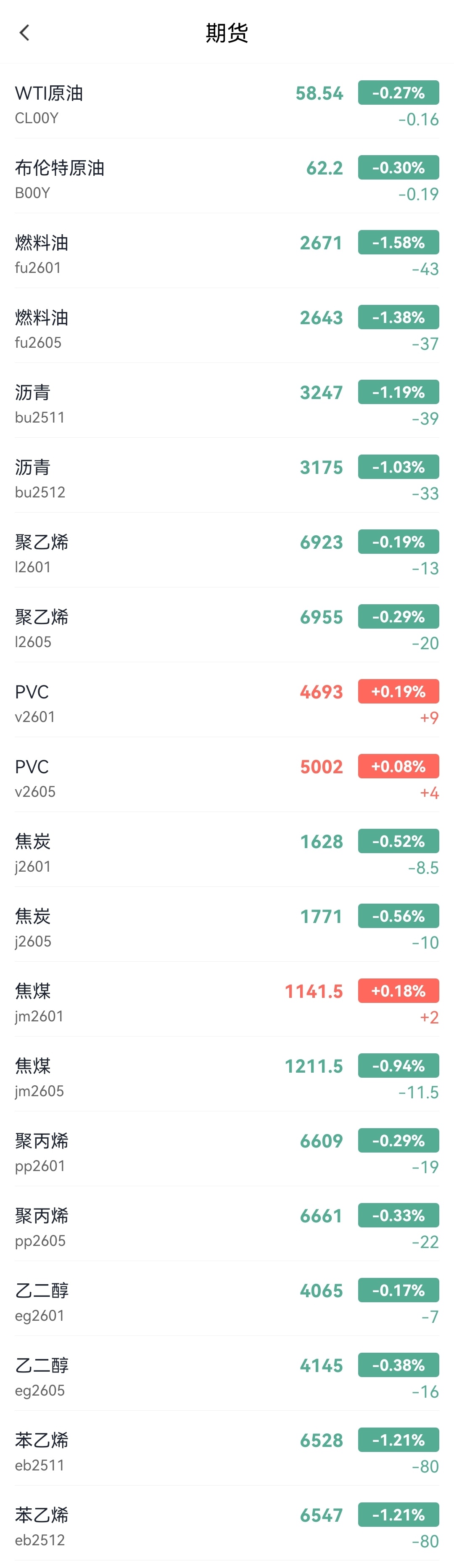 On October 15th, concerns about oversupply risks and trade disputes initiated by the United States suppressing demand prospects led to a decline in international oil prices. The NYMEX crude oil futures November contract fell by $0.43 per barrel to $58.27, a decrease of 0.73% compared to the previous period. The ICE Brent crude futures December contract fell by $0.48 per barrel to $61.91, a decrease of 0.77% compared to the previous period. China's INE crude oil futures December 2512 contract fell by 7.6 to 444.9 yuan per barrel, and in the night session, it fell by 1.9 to 443 yuan per barrel.