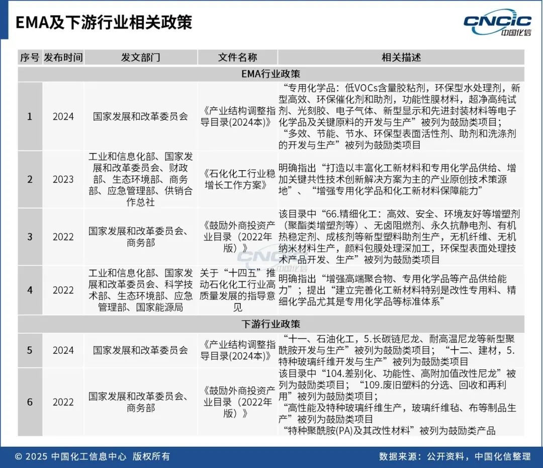 In recent years, China has introduced several policies to encourage the development of related industries and simultaneously support downstream industries of EMA.Special glass fiber, modified nylon specialty materials, and recycled plastics.Developing related industries.