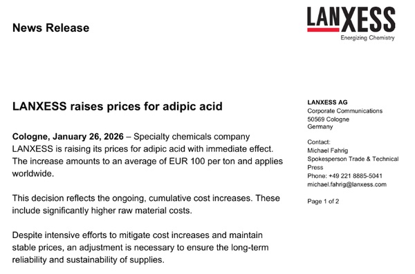 LANXESS, a leading specialty chemicals company, announced a global price increase for adipic acid with an average hike of 100 Euros per tonne applicable worldwide.