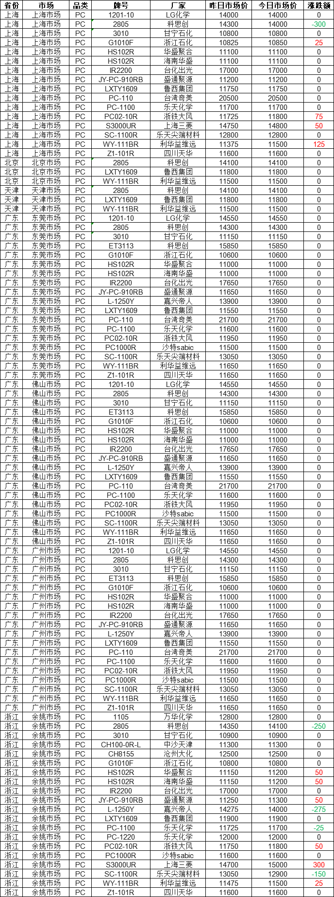 As of 11:00 am on December 9th, the specialized plastics market statistics show that the PC market across various regions in the country is steadily rising! 84% of the market quotes remain stable, with a maximum increase of 300 yuan. The current quote for Shanghai Mitsubishi S3000UR in the Yuyao market is 15,000 yuan. Today's PC market quote range is between 10,600 and 21,700 yuan, with the median price being 11,675 yuan.