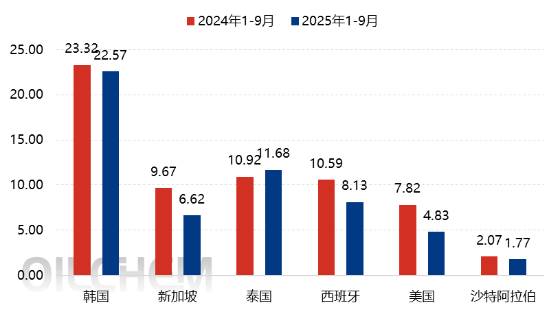 In contrast, the import volumes of Singapore, Spain, the United States, and Saudi Arabia from January to September 2025 have all decreased compared to the same period in 2024. Singapore's imports fell from 96,700 tons to 66,200 tons, Spain's from 105,900 tons to 81,300 tons, the United States' from 78,200 tons to 48,300 tons, and Saudi Arabia's from 20,700 tons to 17,700 tons. The contraction in import volumes from these countries has created a certain degree of offset to the overall import scale.