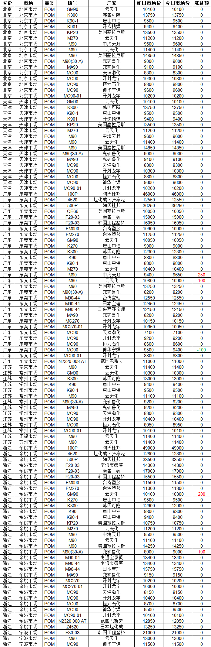 According to CPRIA Plastics, as of 16:00 on January 27th, POM market prices in various regions across the country are stable with slight increases! 95% of quotations in the entire market remain stable, with the highest increase of 250 yuan. Currently, the quotation for Haitian Yew M90 in the Dongguan market is 9650 yuan. Today, the quotation range for POM in the entire market is 7100-49000 yuan, and the market median is 10300 yuan.