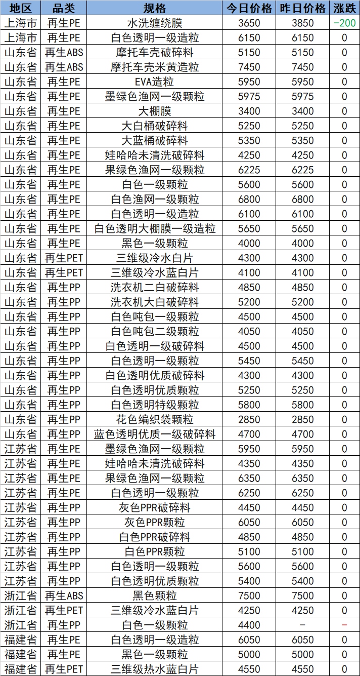 Abstract: On October 22, the recycled plastic market in East China saw a new price in the morning! The recycled market in East China is stable with some declines. In Shanghai, recycled PE fell by 200, reported at 3850-6150; recycled PP in Jiangsu is reported at 4450-6050. The current spot supply from recycled manufacturers is acceptable, mainly trading with old customers. Downstream product manufacturers are slowly following up on new orders, with small inquiries. Due to the previous decline in pellet prices, recycled manufacturers have a low acceptance of high-priced raw materials from upstream, and the continued decrease in new material prices has led to price reductions at packing stations.
