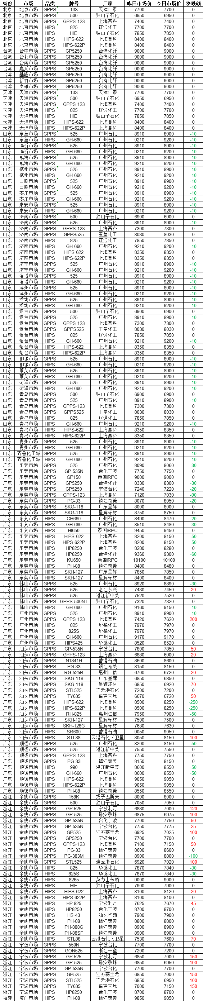 As of 16:00 on October 23, the PS market across the country has been stable with a downward trend according to the Special Plastic Vision statistics. 51% of the market quotations remain stable, with a maximum drop of 250 yuan. The current quotation for Shanghai SECCO HIPS-622 in the Shantou market is 8,250 yuan. Today's PS market quotation range is 6,720-10,100 yuan, with a median of 8,350 yuan.