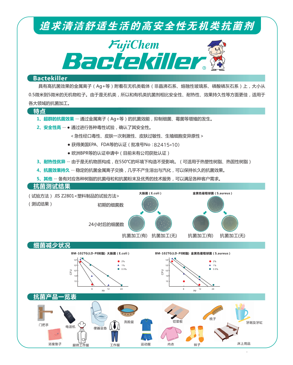 BM-502KEThis belongs to the silver-zinc composite system product, also a white powder, with an average particle size of about 6μm. While maintaining the high antibacterial efficiency of silver-based antibacterial agents, it further optimizes water resistance and light resistance, significantly reducing the risk of silver ions discoloration. This product is suitable for various resins such as PP and PE, with a recommended addition amount of 0.3%-0.5%. It has been successfully applied in kitchenware, home appliances, and fiber products.
