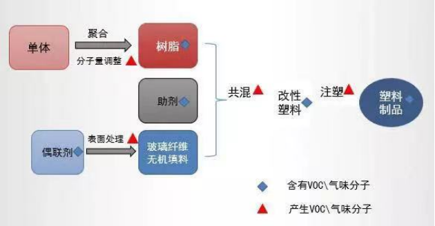 In addition to the odor threshold and odor type of VOCs themselves, different people have significant differences in their perception of odors. The smell emitted by plastic products that we usually detect is composed of various molecules, and its generation process is illustrated in the following diagram.