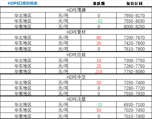 According to Zhuansu Shijie Statistics, on October 23, the HDPE market in major regions across the country saw more increases than decreases. Specifically: the HDPE film market in North China remained stable compared to yesterday; the East China market dropped by 50 yuan; the South China market remained stable. The HDPE pipe market in North China increased by 80 yuan; the East China market rose by 30 yuan; the South China market remained stable. The HDPE wire-drawing market in North China increased by 10 yuan; the East China market rose by 20 yuan; the South China market increased by 210 yuan. The HDPE hollow market in North China rose by 30 yuan; the East China market remained stable; the South China market remained stable. The HDPE injection molding market in North China dropped by 10 yuan; the East China market rose by 50 yuan; the South China market remained stable.