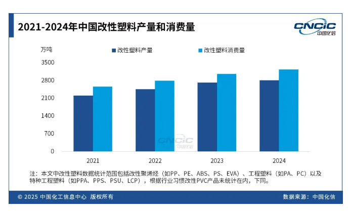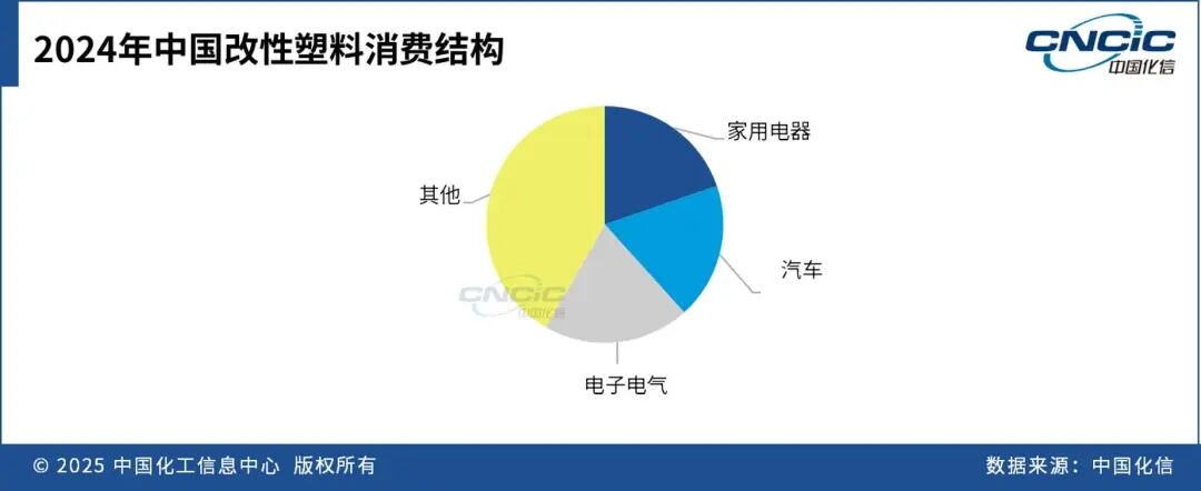 With the continuous transfer of global industries such as automobiles, home appliances, office equipment, and power tools to China, along with the vigorous development of the domestic economy and the deepening trend of "substituting plastic for steel" and "substituting plastic for wood," China has become the largest modified plastics market in the world and serves as the main engine for global demand growth. Against this backdrop, the demand for modified plastics in China has rapidly increased from 25.59 million tons in 2021 to 32.25 million tons in 2024, with a compound annual growth rate (CAGR) of 8.0%. In 2024, China's consumption of modified plastics is expected to grow by 5.6% year-on-year, driven mainly by two key factors:On one hand, the "trade-in" policy has effectively boosted consumer demand in traditional sectors such as home appliances and automobiles. On the other hand, the demand for modified plastics in emerging fields like new energy vehicles, low-altitude aircraft, and intelligent robots is continuously emerging, expanding application scenarios and increasing product market share.