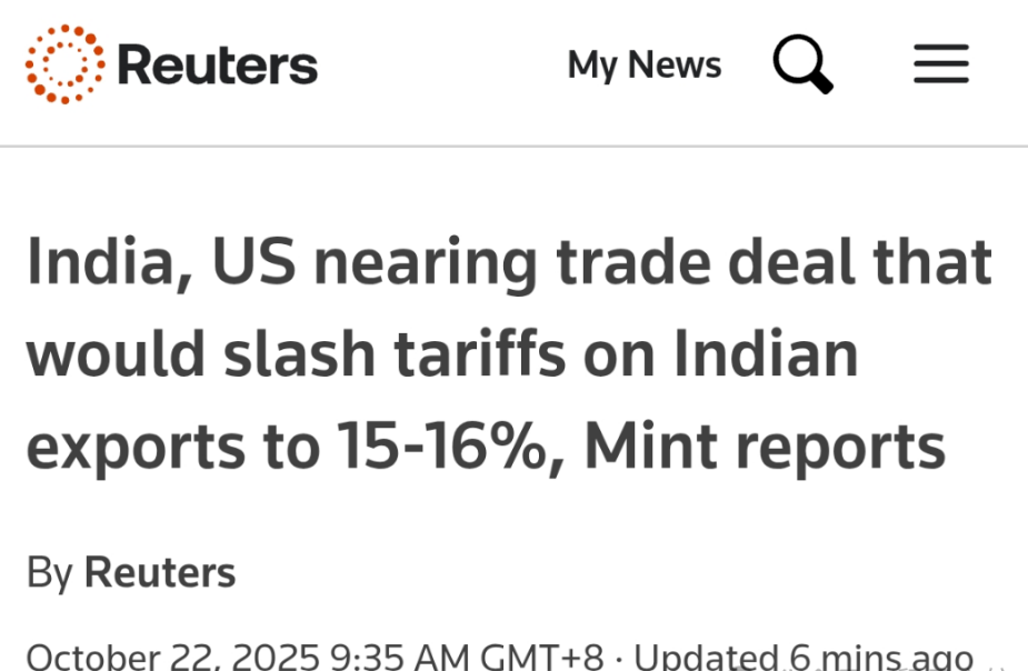 October 22 news,India and the United States are nearing a long-stalled Bilateral Trade Agreement (BTA) aimed at significantly reducing India's export tariffs to the U.S.Reduce from the current 50% (including a 25% retaliatory tariff and a 25% punitive tariff on purchasing Russian oil) to 15%-16%.This progress may be formally signed by U.S. President Trump and Indian Prime Minister Modi at the ASEAN summit at the end of October.