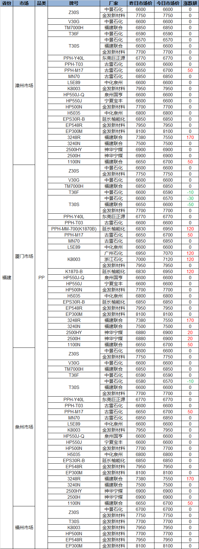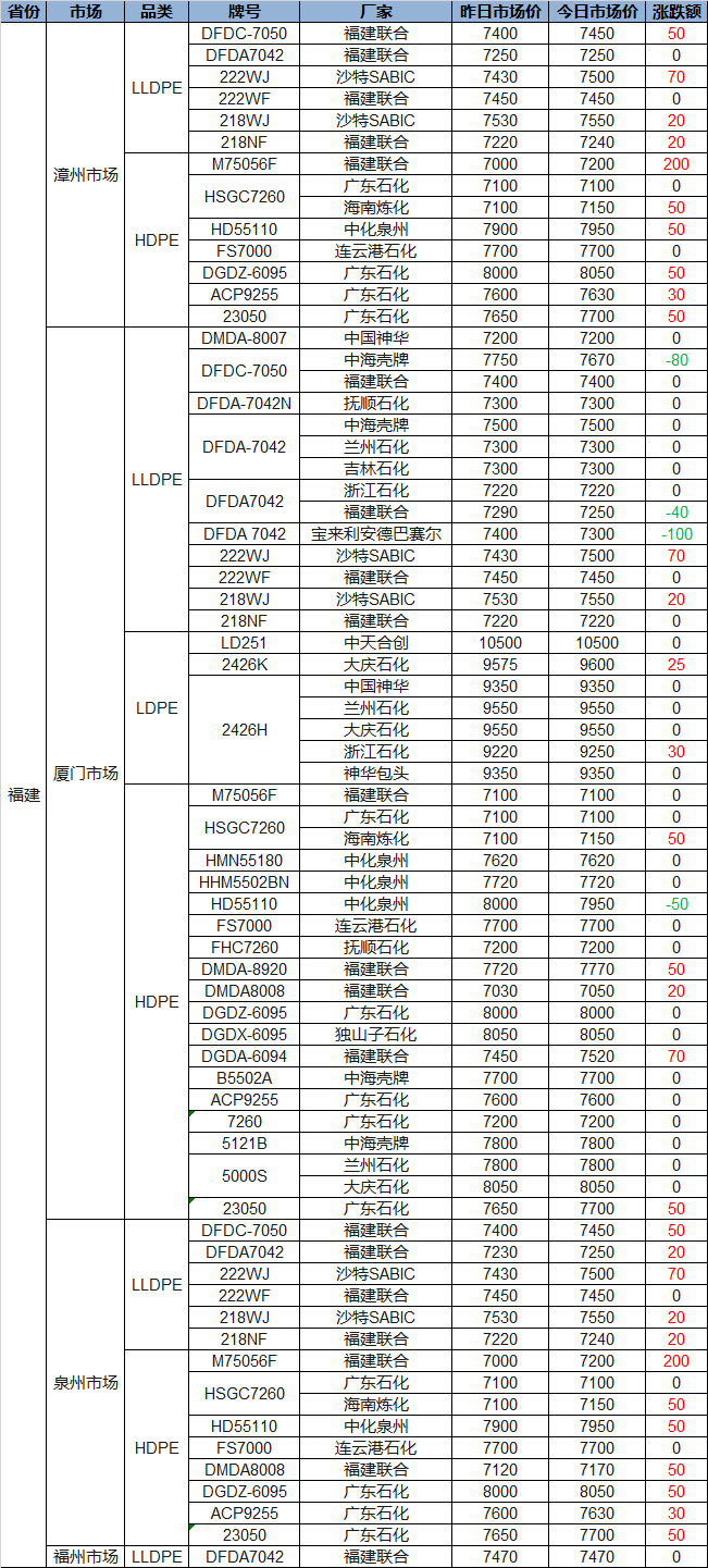 Today PP and PE Prices in Fujian Show Mostly Gains! PP Up by 50-170, PE Up by 200 at Most