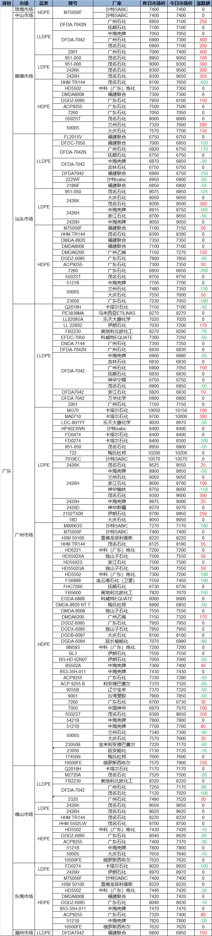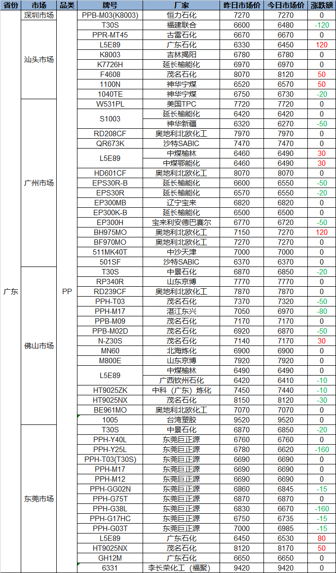Summary: December 9th, Guangdong polyolefin market morning new prices! PP fluctuated narrowly, mostly up or down by 10-120, with the highest drop of 160; PE exhibited mixed changes, with some prices up or down by 10-300, the highest increase being 400 and the highest drop being 450.